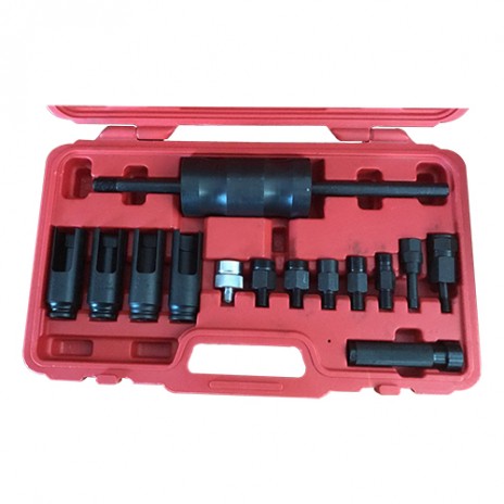 Professional 14pcs injector puller tool set is included 1 piece of 3.9kg slide puller, 1 pieces of tamper proof key, 1 piece of ball joint, 4 pieces of 100mm 6pt injection nozzle sockets and 7 pieces of adaptors. The special set is fitted with slide hammer for satisfied the wide range usages. It is designed to repairing all same injection nozzle vehicles.