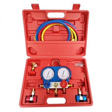 It has a hardened copper fitting and high-quality color-coded hoses, high safety degree. The high quality 134a refrigerant gauge set contains 3 pieces of 1.5m color coded hoses, 1 piece of professional 1107 adjustable coupler, 1 piece of multi-functional valve spanner, 1 piece of adjustable high pressure fitting, 1 piece of adjustable low pressure fitting, 2 pieces of r134 high quality two valve gas meters and 1 piece of blow molded case.